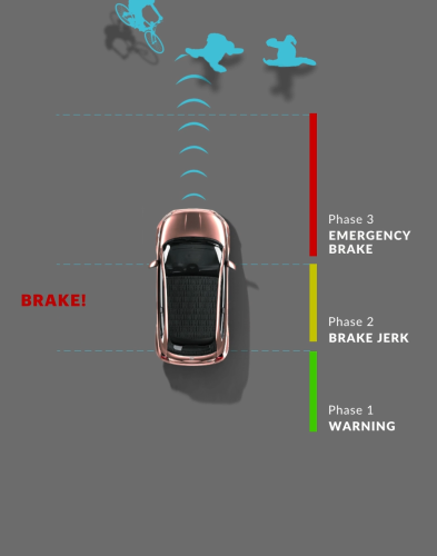 500e can brake automatically to avoid or mitigate collision with a vehicle in front, a pedestrian or a cyclist, at up to 80 mph (where legally permitted). Initially the car alerts the driver with an acoustic and visual warning in the instrument cluster. If the driver does not respond, the car brakes helping to avoid or mitigate potential impact.