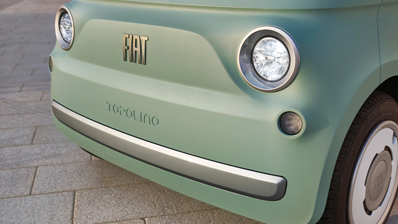 New Topolino turns heads with its charming matt-silver detailing, such as the light surrounds at front...
